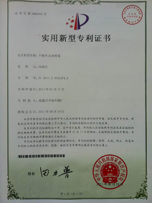 平板車支承轉(zhuǎn)盤專利證書